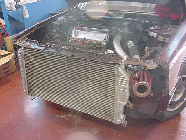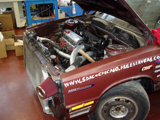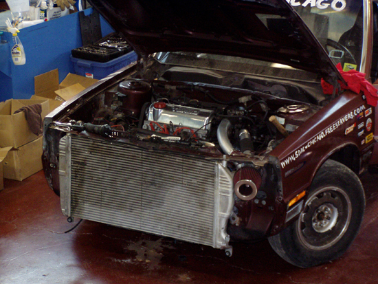 Thanks to JT, Dave, and Karl for plumbing the intercooler, swapping the front motor mount, installing the FWD Performance underrdrive pulley, mounting the trans cooler, gutting / welding the DS rear door, etc.